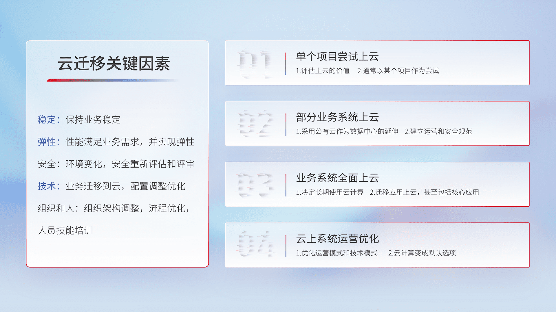 结合实际业务,,,从规划设计、、、、云平台选型、、、云原生改造、、、、数据迁移、、集成交付,,迁移全过程为客户识别最佳上云路径,,,,做好风险识别管理,,设计网络架构、、、、身份权限、、、安全审计合规、、、、操作审计、、、日志审计、、、、监控告警策略、、、多站点容灾设计等,,对云上基础设施进行整体规划,,,提升IT治理水平,,以满足弹性、、高可用、、、高性能的需求。。。。
