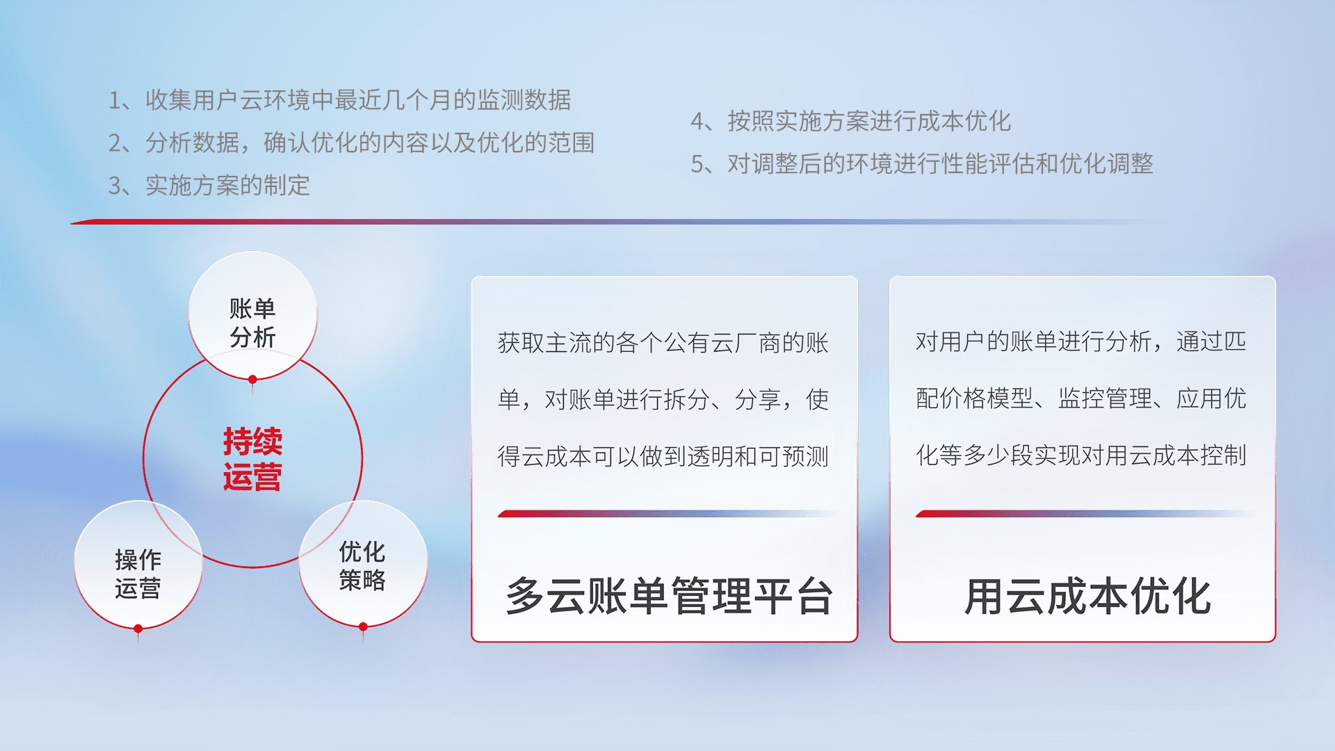 通过多云纳管,,,,以统一的资源数据模型把客户的云资源进行抽象和封装,,,,进而实现对多云资源的统一操作,,保障云资源管理的可靠性、、、、稳定性与可用性。。量身定制化运维内容,,配置、、开发运维、、、、补丁管理、、、备份、、、、监控、、、认证和访问管理、、、审计和日常巡检等,,,保障在用云过程中的可靠度,,稳定度以及高可用率。。。